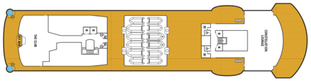 The liveliest lounge on board is the scene of daily afternoon tea service. It is a popular spot for pre-dinner drinks and dancing to live music. After dinner, the dancing music continues, and later a DJ spins dance music until late at night. Another terrace of open deck aft of The Club boasts a plunge pool and two small whirlpool spas.