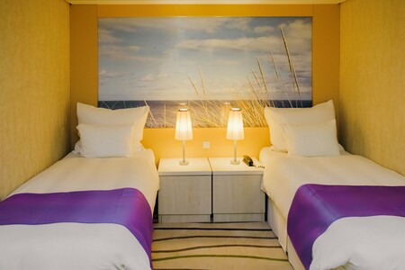 The aft Inside Cabin (Sun Deck 12) is located towards the rear of the ship, with access to the fresh air and open views of the Sun Deck, as well as a short journey to the spa, pool area, and Borough Market on Lido Deck 11. The cabin's two twin beds can be converted to a double bed, and some have a third and or fourth upper berth.