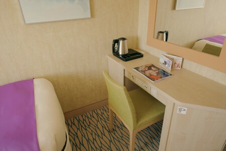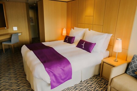 The forward Ocean View Cabin (Ambition Deck 8) is located just one deck above The Cavern. Below on Promenade Deck 6 you can enjoy The Palladium as well as bars, lounges, and restaurants including Holyrood and Saffron. This cabin offers an ocean view, two twin beds, and the majority of cabins can be converted to a double bed arrangement.