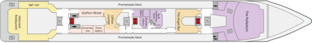 he aft De-Luxe Suite (Ambition Deck 8) is located towards the rear of theship, with ideal access to The Cavern on Boat Deck 7. Further below on Promenade Deck 6 you can enjoy The Palladium as well as bars, lounges, and restaurants including Holyrood and Saffron. The De-Luxe Suite includes a private balcony with ocean view, sitting area, walk-in wardrobe, double bed, and a double sofa bed that can accommodate a third or fourth guest.
