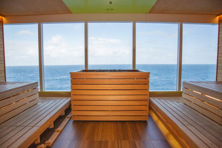 A fully equipped gym with cardio and resistance machines — all facing floor-to-ceiling windows at the ship’s stern. Work out while watching the ship’s wake trail into the horizon.