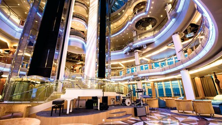 The heart of the ship is taken over by a spectacular five-storey atrium. Think panoramic windows, mood lighting, and Willy Wonka-esque glass lifts. Low-key entertainment is held here, with an agenda that includes cabaret performances and cocktails with the captain.