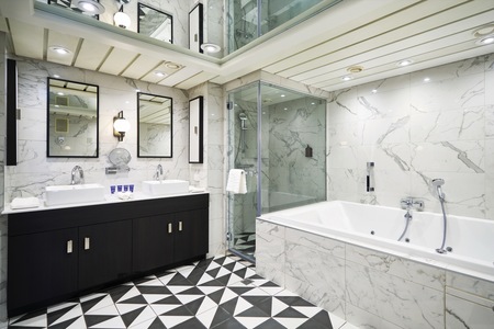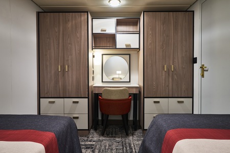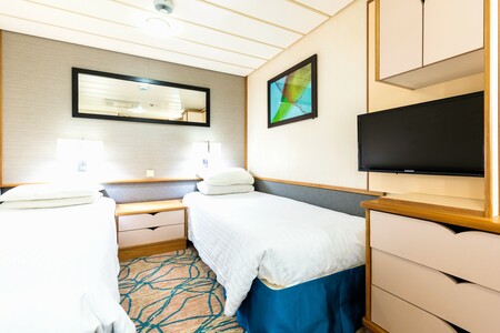 These cabins feature twin beds that can convert to a queen-size double bed and an en suite with a WC and a shower. These cabins are on decks 6, 7 and 8, sleep two, and measure between 12 and 13 m².