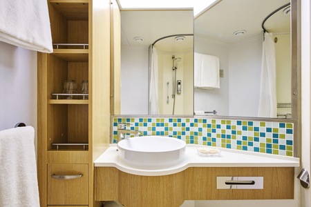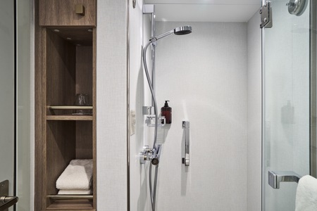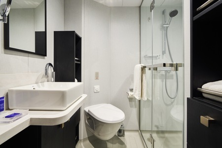 These are on deck 3, and accommodate solo travellers. The cabin is kitted out with twin beds that convert to a queen-size double bed and an en suite with a WC and a shower. These cabins measure 12 m².