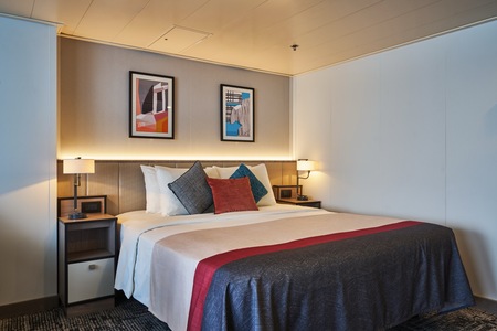 These cabins are on decks 7 and 8 and got a full refurbishment in November 2024. They come with the bonus of a floor-to-ceiling window. You'll sleep on twin beds, which can also convert to a queen-size double bed, and have use of a sitting area with a sofa-bed and an en suite with a WC and a shower. Deluxe Cabins sleep up to four and measure a little over 20m². Please note window size may vary by cabin.