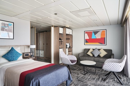 The Grand Suites on deck 8 got a full refurbishment in November 2024. They have twin beds that can convert to a queen-size double bed, and a sitting area with a sofa-bed, and can sleep four people. You'll get a bathroom with a WC and a walk-in shower. There's a balcony for admiring the sea views, too. Grand Suites measure 32m². When you book a cabin with Suite Service included, you can look forward to one continental breakfast in bed per person per week, and a free pressing service for up to three items during your stay. On top of that, you'll have a coffee machine, slippers, a dressing gown, upgraded toiletries and a choice of pillows to best fit your comfort needs.