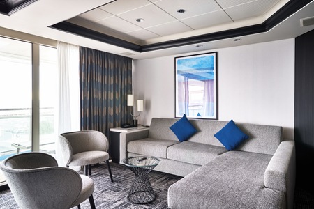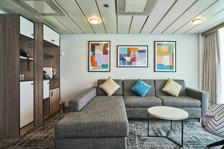 Junior Suites on Deck 8 sleep up to four and got a full refurbishment in November 2024. They'veve got twin beds that can convert to a queen-size double bed, and a sitting area, as well as a bathroom with a WC and shower, and a balcony. If there are four of you, you'll also get a sofa-bed. These cabins measure around 21m². When you book a cabin with Suite Service included, you can look forward to one continental breakfast in bed per person per week, and a free pressing service for up to three items during your stay On top of that, you'll have a coffee machine, slippers, a dressing gown, upgraded toiletries and a choice of pillows to best fit your comfort needs.