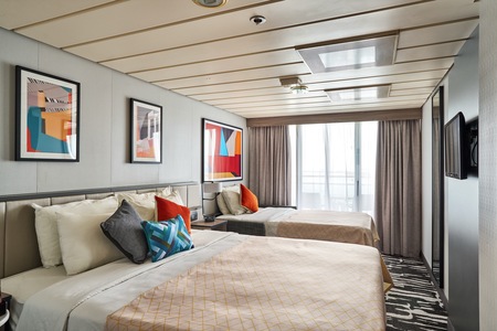 The Family Junior Suite sits on deck 8 and got a full refurbishment in November 2024 and sleeps up to six. It's got one bedroom with twin beds, and a living area with a double sofa-bed and twin beds that convert to a queen-size double bed if needed, as well as an en suite with a WC and a shower. A private balcony with double doors comes as standard. The cabin measures around 39m². When you book a cabin with Suite Service included, you can look forward to one continental breakfast in bed per person per week, and a free pressing service for up to three items during your stay. On top of that, you'll have a coffee machine, slippers, a dressing gown, upgraded toiletries and a choice of pillows to best fit your comfort needs.