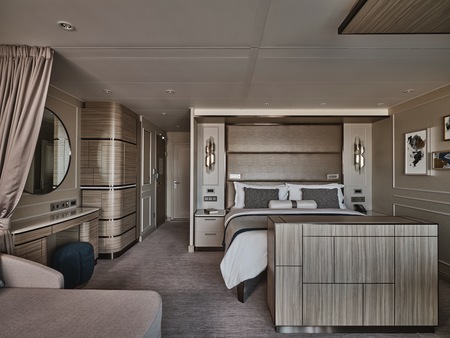 Supremely spacious and superbly located, the Owner’s Suite is the most luxurious suite on board. Located in the premium bow position on deck 7, the Owner’s Suite offers amazing destination immersion, thanks its enormous surrounding balcony and incredible views from all indoor areas. The large living room, separate dining area, and well-stocked bar are perfect for sharing a moment with like-minded travelers while the luxurious and well-appointed bedrooms ensure supreme comfort any time of the day or night.