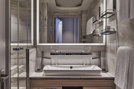 Located on the lower decks in the bow, the Classic Veranda Suite offers all the comfort and attention to detail that you can expect aboard—both inside and out. A generous expanse of interior comforts—elegant decor, a stunning marble bathroom, and ample seating area (with a sofa bed that is able to accommodate a third berth)—offers everything you need for a comfortable cruise. But perhaps this suite’s finest asset lies just outside, as floor-to-ceiling glass doors open onto a private veranda, making every sunset feel as if it is yours alone.