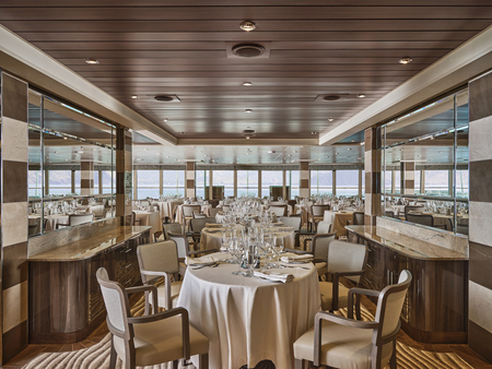Silversea’s signature French restaurant, La Dame is the epitome of fine dining. Featuring the rich, smooth flavors of France, La Dame’s reputation for gastronomic excellence is fully upheld aboard Silver Moon. Expect only the very best: chic, contemporary style, vast ocean-view windows, crisp, white table linens, and impeccable white-gloved service with a smile. Decorated with custom-made interior panel compositions created by Lalique, there is no better place to feel the culinary soul of France than in La Dame.