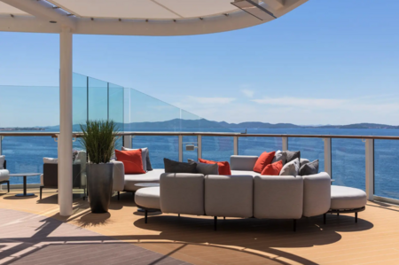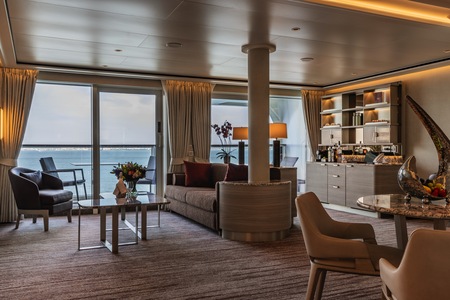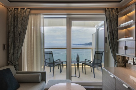 The Otium Suite is one of our newest and finest suites. Located in the premium aft corner position, the Otium Suite has a total size of 123 m2 (1,324 sq ft), including a 40 m2 (431 sq ft) balcony, which comes complete with a whirlpool. Features include a spacious living room area, a luxurious walk-in closet, a separate large bedroom, plus a bathroom with a whirlpool bath and walk-in shower. The crowning glory of the Otium Suite, however, is surely its unprecedented 270-degree view, giving you some of the best possible views of your destination.