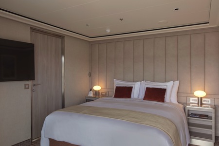 Silver Ray’s Junior Grand Suite is a comfortably sized home away from home. Spaciously proportioned with 54–58 m2, or 581–624 sq ft, including 6 m2, or 64 sq ft, of balcony the Junior Grand builds on the success of the Grand Suite. It has inherited the best features of the Grand Suite by being positioned in the top bow position, offering spectacular views of the destination. The interior layout features a spacious living and dining area, as well as a secluded bedroom. The large bathroom features a double vanity, whirlpool bath, and walk-in shower.