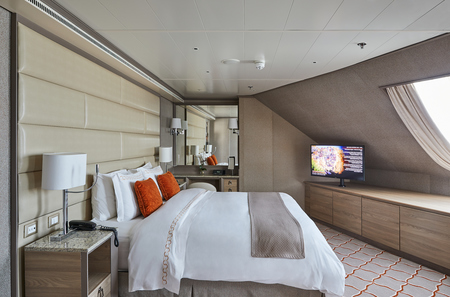 Located on the upper deck, and offering spectacular sunset views, the Superior Veranda Suite has all the comforts and luxury that you can expect aboard. A comfortable living space, attention to detail and a generous expanse of amenities, this stunning suite makes for a cosy home while on the seas. But perhaps this suite’s finest asset lies just outside, as floor-to-ceiling glass doors open onto a private veranda, making every sunset feel as if it is yours alone.