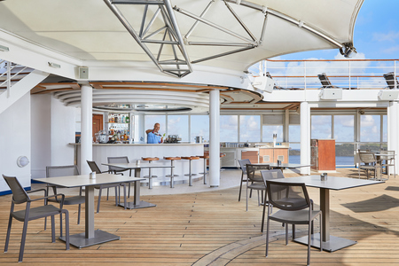 The Atrium aboard provides a unique space at the heart of deck 5. Filled with natural light, a beautiful and spacious bar blurs the line between traditional bar and modern brasserie, and offers an all-day venue for drinks and snacks in a relaxed, welcoming atmosphere. The elegant café serves light bites, as well as smoothies, fresh juices, bespoke cocktails, and wine by the glass from our extensive drinks menu, and it is the ideal place to meet your friends, grab a coffee or aperitif, and plan your next adventures.