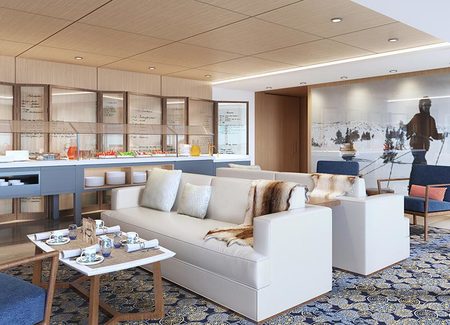Located high on the ship to maximize views through the floor-to-ceiling windows, here guests can listen to classical music or a soothing piano sonata. With Nordic furnishings, relevant and engaging books, and a wall mural of a variety of whales represented to scale, guests will find both comfort and enrichment.