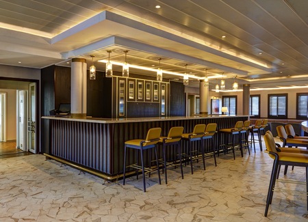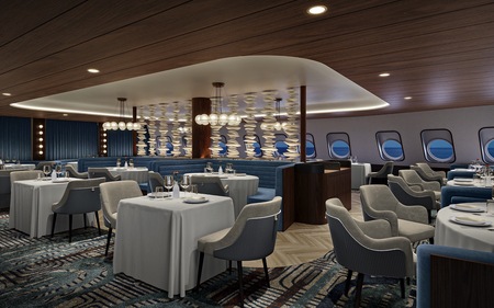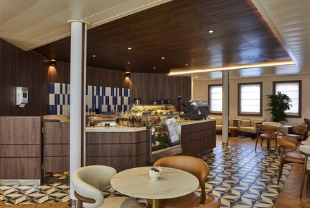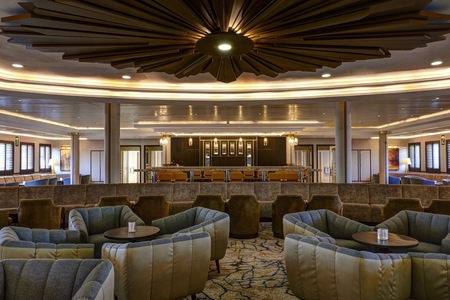 The ship’s Compass Rose features comfortable, modern décor with pops of blue and orange, a chic bar, and a new multi-purpose stage area ideal for live music and local performances.