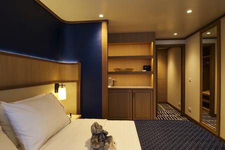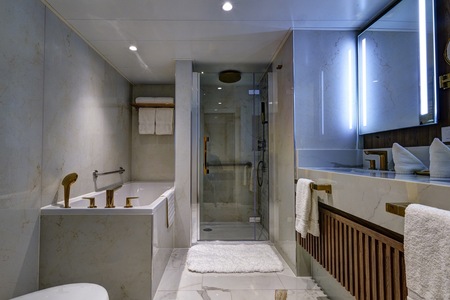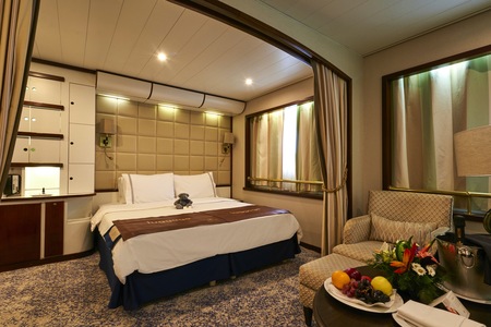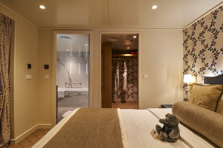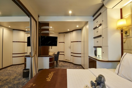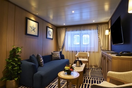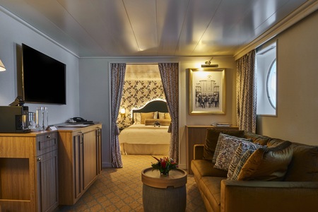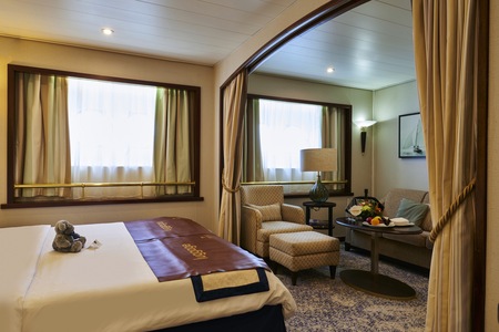 With 376 square feet, you'll find the perfect space for time together - and plenty of room for time to yourself. You'll even enjoy two full separate bathrooms. All the amenities of the staterooms await you, plus a beautiful sitting area, and two flat-screen television sets.