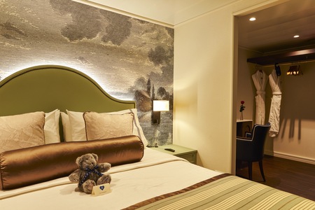 Broadmoor Suite - Inspired by the design of The Broadmoor, this suite offers a traditional space with classic furniture, floral motifs, white trim with gold finishes, and wide crown moulding. New furnishings and wall sconces have been specially commissioned in the resort's style. The striking wallpaper used in the suite's walk-in closet is an exact replica of the wallpaper used throughout The Broadmoor. The resort's signature carpeting, with shades of light blue, brown, yellow, and gold, was also recreated for the space. Historical black and white images of The Broadmoor will be on display.