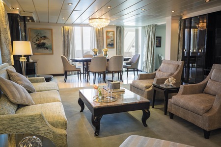 You'll find Park Avenue chic onboard Seven Seas Mariner® in this spectacular suite. Elegant rosewood furniture, luxe fabrics and a crystal chandelier create sophisticated comfort, while a personal butler is available to fulfil whatever requests you may have. With two bedrooms, two-and-a-half baths, a large living room and two private balconies, this sublime suite is perfect for hosting new friends in luxury.