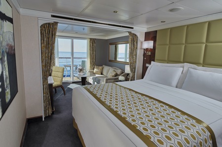 This suite is decorated with soothing colours, pleasing artwork and comfortable furnishings. Relax in the sitting area after an exciting day ashore and enjoy the selection of fresh canapés delivered by your personal butler. Then retreat to your private balcony to watch the ever-changing vistas. In your glistening bathroom, marvel at the assortment of luxury bath soaps and shampoos as you ponder whether to use your tub or walk-in shower.