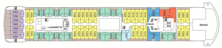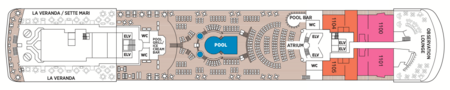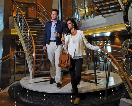 At the hub of the ship, our Atrium is an inspiring testament to the grandeur of luxury ocean travel. Center staircases connect conveniences on Deck 5 to the social spaces of the Voyager lounge and Casino, as well as Compass Rose on Deck 4. This makes it a natural gathering place for guests, signified by a beautiful compass-shaped tile floor at the landing.
