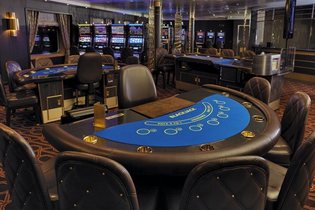 Glass doors lead to an elegant setting bustling with games of chance that include Blackjack, roulette, poker and slot machines. The Casino is open every day at sea when not restricted by territorial border limits.